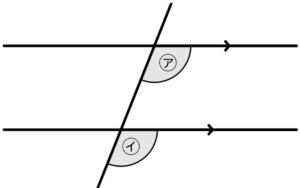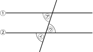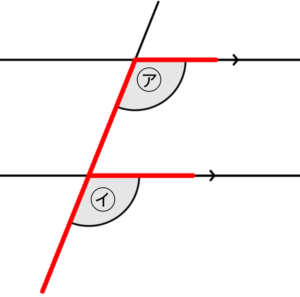 2本の平行な線に、もう1本の線が交わると、同じ位置に角(角㋐、角㋑)ができます。