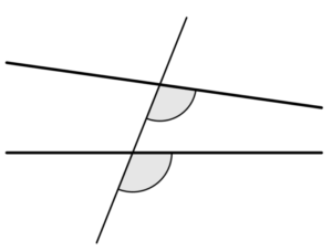 平行な2本の線と、そこに交わる1本の線で「F」の形をなぞると、そのカドにある2つの角が同位角になります。