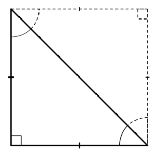 二等辺三角形なので底角は等しく、直角以外の角はどちらも45°になる!