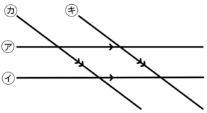 横にのびた2本の直線が「平行」であれば、同位角である角㋐と角㋑は角度が等しくなります。