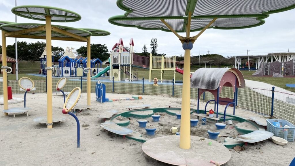 ここは沖縄県内でも有数の広さを誇る遊び場で、遠くからでも目立つ巨大な白いドーム状の遊具が目印です。