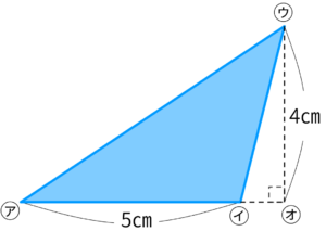 底辺㋐㋑を右側に点線で伸ばして、てっぺん㋒から真っ直ぐ下ろした垂直な線㋒㋔。これがこの三角形の「高さ」です。