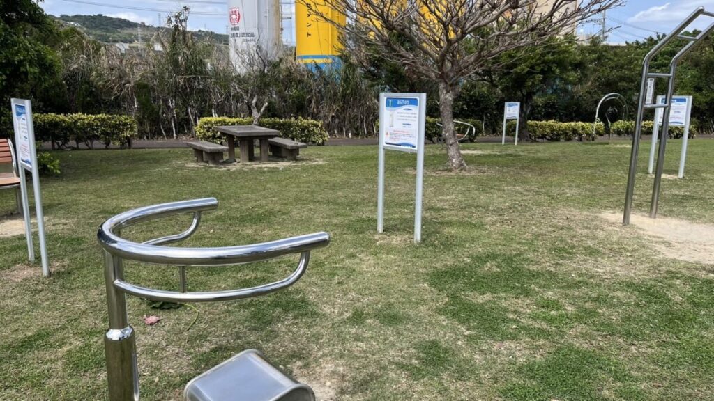 公園の一角には、大人が体をほぐすのにぴったりな健康遊具のコーナーもありました。